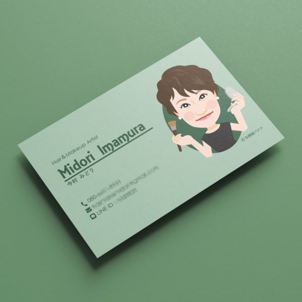 似顔絵名刺 似顔絵名刺 ヘアメイクアップアーティストさんの似顔絵名刺です。メイク道具を手に、お名前に合わせて緑色の名刺に仕上げました。 https://www.instagram.com/mdrimmr/ PREV