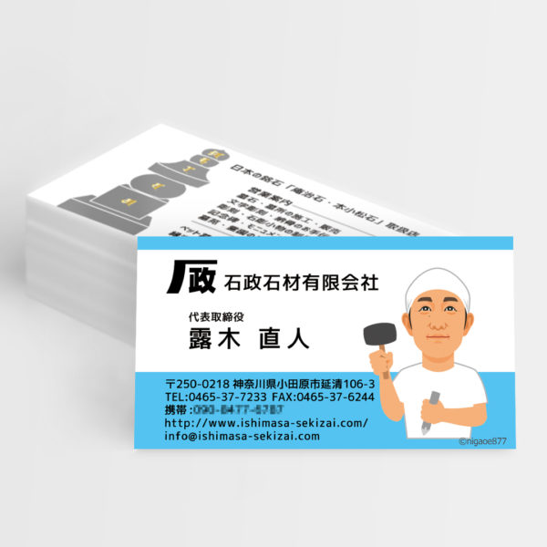 似顔絵名刺 似顔絵名刺 石政石材様 石政石材様の似顔絵名刺です。 道具を持った似顔絵に、裏面には金の箔押し入りで仕上げました。 知人からの紹介で似顔絵名刺を依頼させていただきました。 箔押し印刷や日焼けしてる感をだしてほしいなど何度も対応していただきまして感謝しております。 似顔絵バナナさんにお願いして良かったです。似顔絵名刺をつくる友人がいましたらお勧めしておきますね。 有難うございました。 PREV NEXT
